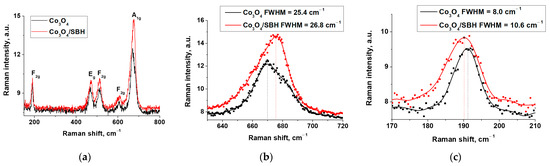 Raman spectra for Co3O4 and Co3O4/SBH (a), A1g peak region (b), and F2g peak region (c).