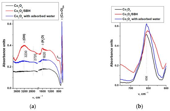 Figure 9a shows that the spectra of Co3O4 and Co3O4/SBH samples differ in the intensity of the broad absorption bands (a. b.) with maximums at 3230 and 2720 cm−1 corresponding to the hydroxyl groups’ valence vibration and at 1620 cm−1 corresponding to the deformation vibration of adsorbed water molecules. These a. b. are more intensive in the spectrum of Co3O4/SBH. This indicates it is impossible to thoroughly dehydrate the sample after treating Co3O4 in SBH solution, washing, and vacuum drying for a long period of time at room temperature. In the spectrum of initial Co3O4, these a. b. are barely visible. The long-time saturation of the surface of initial Co3O4 with water vapor increased the intensity of the discussed absorption bands. However, the intensity achieved is significantly lower than the intensity of vibrations of water and hydroxyl groups in the spectrum of Co3O4/SBH. This suggests that the high water content on the surface of the Co3O4/SBH sample is due to its stabilization at the anionic vacancies. In addition, the increased background absorption in the Co3O4/SBH spectrum indicates the presence of free charge carriers (CoBn) and the possible formation of proton conductivity by involving hydroxyl groups in the hydrogen bond.