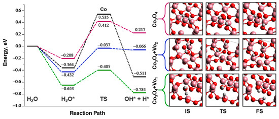 As mentioned earlier, previous studies have already investigated the reduced forms of cobalt (CoBn) that are produced in situ from cobalt precursors and play a crucial role in catalyzing the studied processes [17,23,24,25]. However, the main focus of this study is on the amount and state of the remaining Co3O4 phase and its influence on the results of KIE measurements and DFT modeling of the water activation stage.