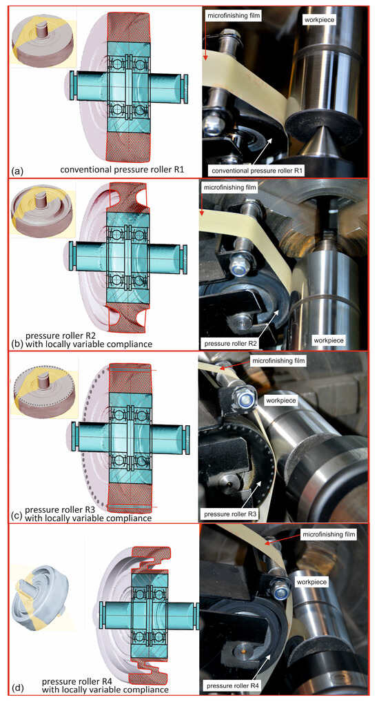 Three-dimensional models, technical drawings, and photos from the microfinishing process of the conventional pressure roller R1 (a) as well as the investigated prototypes of pressure rollers: a pressure roller R2 with symmetric lateral cuts in the cross-section of the elastomer layer (b), a pressure roller R3 with holes in the elastomer along the cylinder generating line (c), and roller R4 with deep, asymmetric cuts in the cross-section of the elastomer layer (d).