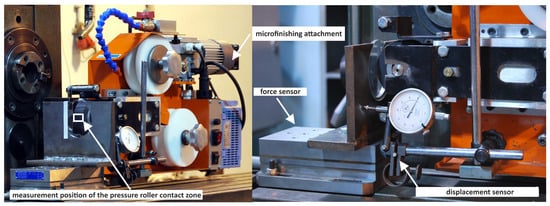 An integral part of the research on the prototype pressure rollers was determining their compliance and the surface contact area with a flat surface as a function of the pressing force. For this purpose, a research setup was constructed (Figure 4). GW–1 microfinishing attachment external cylindrical surfaces were used for the experiments, and a transparent pressing surface was designed to enable the determination of the contact surface area of the rollers with the flat surface. The roller pressing against the machined surface in the GW–1 microfinishing attachment was performed pneumatically. The transparent pressing element was mounted on a piezoelectric force sensor 9257B from KISTLER (Winterthur, Switzerland), which was connected to a multi-channel signal amplifier 5070A 12100 from KISTLER, a PC equipped with a measurement card 2855A4 from KISTLER. After mounting the displacement sensor, the relationship between the deflection of the tested prototype pressure rollers and the normal force was determined.