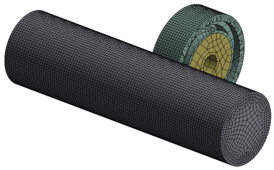 The simulation was conducted for the case of the spatial deformation state. Solving the posed problem of determining stresses and material displacements of the pressure roller was performed using the implicit integration method. The machined shaft was modeled as a deformable body, while the pressure roller was modeled as a hyperelastic element. The object was discretized with approximately 70,000 eight-node solid elements (Figure 6). Due to the analyzed geometry, the SOLID 186 finite element type with a nonlinear shape function was chosen, which ensured good mesh fit to the geometry, particularly on radii. Translational and rotational degrees of freedom were constrained on the lateral surfaces of the shaft. Subsequently, displacement boundary conditions were applied to the roller, with a displacement of a = 2 mm.