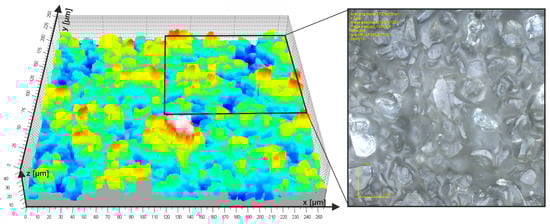 The topography image of the microfinishing film surface with a nominal grain size of 15 µm and an optical photograph of the tool surface measuring 129 × 129 μm, taken using the Olympus OLS4000 (Tokyo, Japan) confocal microscope.