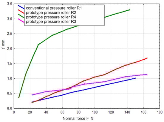 The graph of the deflection of pressure rollers as a function of the applied normal force.