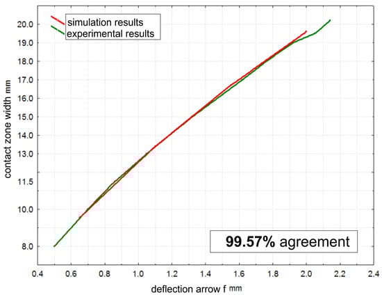The applied constitutive material model refers to the second Piola–Kirchhoff stress tensor [42,43]. In the analysis, the Blatz-Ko equation, which describes the hyperelastic model of rubber, was utilized [44]. To ensure the correctness of the conducted analysis, the material model was validated. Compression of the conventional pressure roller R1 against a flat surface was simulated, and experiments were conducted on the test rig presented in Figure 4, utilizing a vision system for data acquisition, made possible by a transparent visor onto which the pressure roller was pressed. The width of the contact zone was examined as a function of the deflection, and comparisons were made with simulation results (Figure 9).