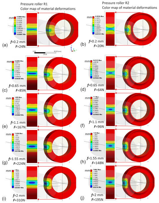 Displacements of the elastomer layer of the conventional pressure roller R1 for successive values of deflection arrow f, 0.2 mm (a), 0.65 mm (c), 1.1 mm (e), 1.55 mm (g), 2 mm (i), and for the prototype pressure roller R2 for successive values of deflection arrow f, 0.2 mm (b), 0.65 mm (d), 1.1 mm (f), 1.55 mm (h), 2 mm (j).