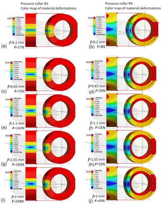 Displacements of the elastomer layer of the prototype pressure roller R3 for successive values of deflection arrow f, 0.2 mm (a), 0.65 mm (c), 1.1 mm (e), 1.55 mm (g), 2 mm (i), and for the prototype pressure roller R4 for successive values of deflection arrow f, 0.2 mm (b), 0.65 mm (d), 1.1 mm (f), 1.55 mm (h), 2 mm (j).
