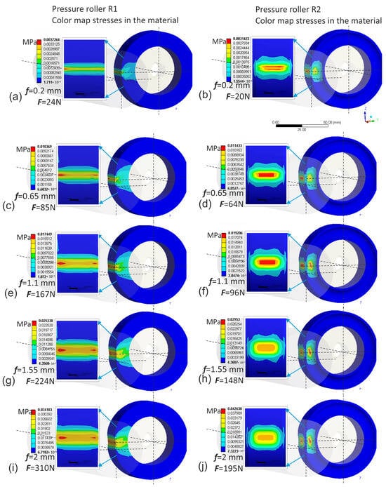 Stresses in the material of the conventional pressure roller R1 for successive values of deflection arrow f, 0.2 mm (a), 0.65 mm (c), 1.1 mm (e), 1.55 mm (g), 2 mm (i), and for the prototype pressure roller R2 for successive values of deflection arrow f, 0.2 mm (b), 0.65 mm (d), 1.1 mm (f), 1.55 mm (h), 2 mm (j).