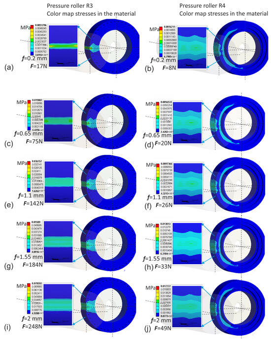 Stresses in the material of the prototype pressure roller R3 for successive values of deflection arrow f, 0.2 mm (a), 0.65 mm (c), 1.1 mm (e), 1.55 mm (g), 2 mm (i), and for the prototype pressure roller R4 for successive values of deflection arrow f, 0.2 mm (b), 0.65 mm (d), 1.1 mm (f), 1.55 mm (h), 2 mm (j).