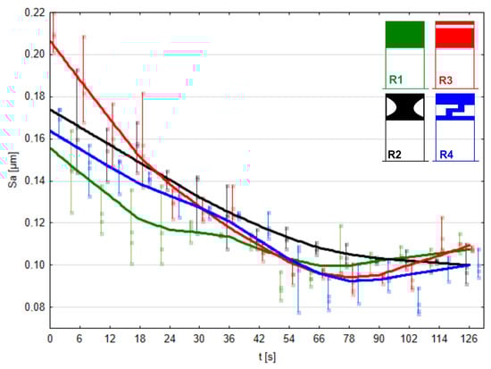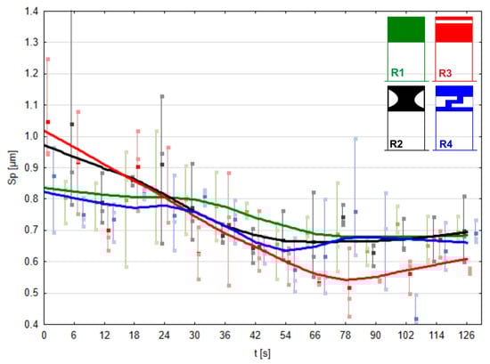 Very promising results regarding surface roughness were obtained by analyzing the Sp parameter, which stands for the surface peak height (Figure 16). Surface peaks play a crucial role in the subsequent operational properties of the surface. The most spectacular results were achieved with the microfinishing process utilizing the prototype pressure roller R3, where surface peaks were removed most rapidly up to the 78 s mark of the micromachining process. Additionally, at the end of the finishing process, the best surface quality was achieved, with the Sp parameter measuring 0.1 μm less than the values of this parameter for surfaces finished using the other three rollers. When analyzing the removal of surface peaks, very similar effectiveness was observed for the conventional roller R1 and the most compliant rollers, R4 and R2.