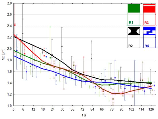 Analyzing the parameter for surface roughness assessment, Sz (Figure 17), which represents the surface height, also appears very favorable when using roller R3. This roller removed surface irregularities most rapidly up to the 90 s mark of the process, and we still achieved the best results at the end of the process. A similar rate of surface irregularity removal can be observed when using pressure roller R2. The effects obtained with the conventional roller R1 and the most compliant roller, R4, analyzing the Sz parameter of the processed surfaces, can be considered similar, both in terms of material removal speed and the achieved effects. This may also have a significant ecological aspect because producing roller R4 requires approximately one-third less elastomer.