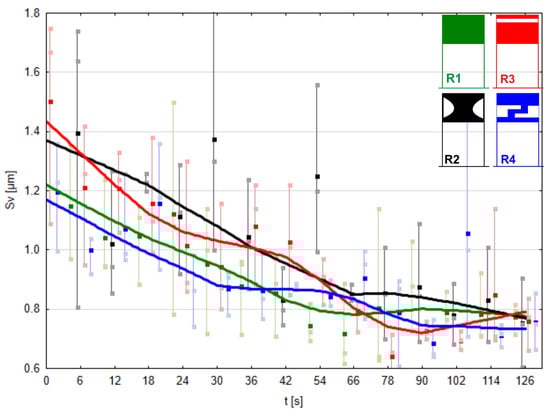 The solid lines in Figure 15, Figure 16, Figure 17 and Figure 18 represent the Locally Weighted Scatterplot Smoothing (LOWESS). It is a data smoothing technique used in Statistica 13 software that involves fitting local regression models to data points. As a result, it produces a smooth curve that tends to reveal local trends in the data without introducing large oscillations. LOWESS fitting is used for trend analysis in data, eliminating noise and revealing more subtle patterns. Analyzing the Sa parameter for surface roughness evaluation, it can be confidently stated that pressure roller R3 removes surface irregularities most rapidly up to the 78 s mark of processing (Figure 15).