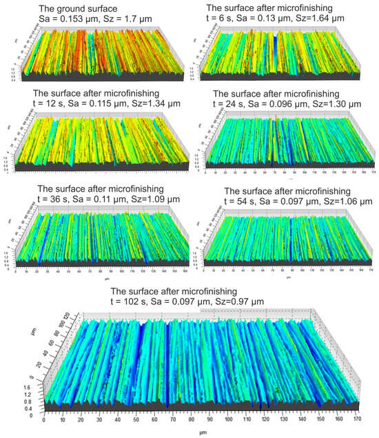 The fact that after 78 s of processing with a 15-micrometer abrasive film changes in the Sa parameter occur much slower, indicating that the machined surface improves only slightly, is due to reaching the almost achieved maximum smoothing capacity of the tool, and further processing with such a tool is economically unjustified. This signals the need to switch to a tool with a lower grit size, as microfinishing is a sequential process. However, considering that our focus was on studying pressure rollers, the process utilized a 15-micrometer nominal size abrasive film.
