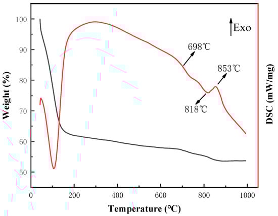 The thermal behavior of the dried gel powder was analyzed using a thermal analyzer (STA 449F3, NETZSCH, Selb, Germany) in the temperature range from 20 °C to 1000 °C under an air atmosphere with a heating rate of 10 °C/min.
