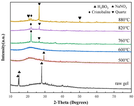 Thermal analysis and phase analysis at different temperatures were conducted on the sol-gel binder powder of component A2, and the specific results are shown in Figure 2 and Figure 3. A distinct endothermic peak was observed in the temperature range of 40 °C to 200 °C, attributed to the evaporation of surface-adsorbed water and organic solvents. In the range of 200 °C to 600 °C, a broad and intense exothermic peak was observed. This phenomenon is not only caused by the continued evaporation of alcohols and water in the gel system, but it also involves dehydration between organic groups (such as [≡Si-OH] and [=B-OH]), and the detachment of [-OH] groups from [≡Si-OH] and [=B-OH]. It is accompanied by the comprehensive exothermic reaction of borate decomposition and integration into the glassy amorphous structure (in the XRD spectrum, the diffraction peak of boric acid disappears after heat treatment at 500 °C). Additionally, between 500 °C and 600 °C, there is also the decomposition reaction of nitrate, releasing heat (the diffraction peak of sodium nitrate appears at 500 °C, while it disappears at 600 °C, indicating that sodium nitrate has not completely decomposed before 500 °C). Based on the thermal analysis spectrum, the glass transition temperature is approximately 698 °C. Subsequently, according to the XRD spectrum, diffraction peaks of quartz appeared at 760 °C, indicating the crystallization of quartz near this temperature. Between 790 °C and 880 °C, the diffraction peak of quartz gradually decreased, while the diffraction peak of cristobalite increased, indicating a crystallization or phase change within this temperature range, corresponding to the exothermic peak near 853 °C in the thermal analysis curve (730 °C to 890 °C).