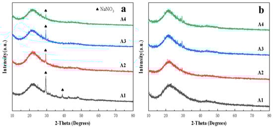 The purpose of the thermal treatment is to remove excess visible physical forms of organic solvents and water, as well as a large amount of nitrate ions, hydroxyl groups, alkyl groups, and other organic substances in the dry gel system. If these organic substances are not thoroughly removed during the gel thermal treatment process, it will adversely affect the performance of the obtained vitrified bond powder. This will lead to the generation of excess pores during the sintering process of the micro-powder and the vitrified bond, which affects the compressive strength of the stacked abrasive. From the previous analysis, it is known that there may still be residual sodium nitrate crystals in the ceramic bond prepared by the sol-gel method after heat treatment at 500 °C. Therefore, in order to determine the heat treatment temperature, X-ray diffraction analysis was carried out after heat treatment at 500 °C and 600 °C for the dry gels prepared at A1 to A4 with different sodium oxide ratios. As shown in Figure 4, the diffraction peak of sodium nitrate is gradually enhanced as the proportion of sodium oxide is increased from A4 to A1. This indicates that the thermal treatment temperature of 500 °C is insufficient to remove the sodium nitrate component from the bond. After thermal treatment at 600 °C, it was found that the diffraction peaks of sodium nitrate in the dry gels of the four component points had basically disappeared, leaving only the amorphous diffraction peaks, confirming the amorphous structure of the sol-gel vitrified bond after thermal treatment. Therefore, 600 °C was chosen as the subsequent thermal treatment temperature for the dry gel.