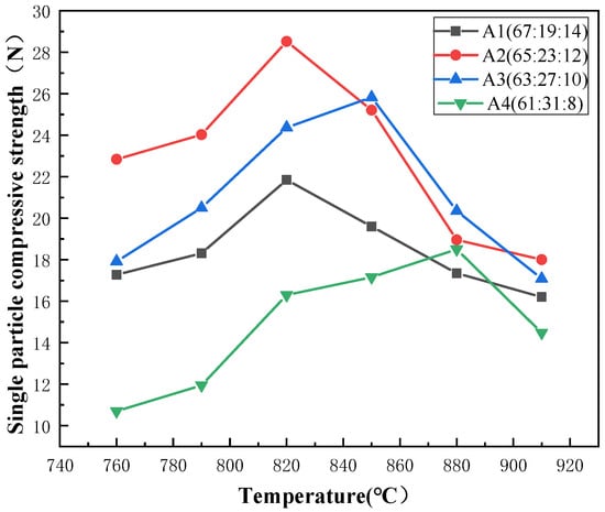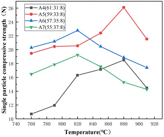 From Figure 7, it can be observed that under the constant sodium oxide content, the decrease in silicon dioxide content and the increase in boron oxide content result in an initial increase, followed by a decrease in the optimal single-particle compressive strength. It reaches a maximum value of 26.10 N at point A5, while the optimal sintering temperature shows a decreasing trend. From Figure 8, the precipitation of quartz crystals undergoes a significant decrease at point A5 followed by a subsequent rising trend with the variation of composition points.