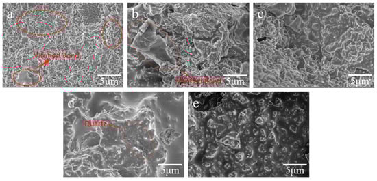 It can be observed from Figure 9a,b that the uneven distribution of the binder between the abrasive grains indicates poor fluidity of the binder, which fails to adequately encapsulate the abrasive grains. In Figure 9c with the temperature increasing to 820 °C, it is observed that although there is a small amount of silicon dioxide crystals generated, the fluidity of the bond is high enough to allow the bond melt to completely encapsulate the abrasive grains. The high temperature melt of the bond flows better between the alumina abrasive grains, enveloping them comprehensively, thus achieving a uniform and dense structure of the stacked abrasive grains. In addition, the phase analysis shows that the cristobalite crystals have disappeared at this temperature, and the amount of quartz crystallization is small, which has a weak impact on the compressive strength. As the sintering temperature reaches 850 °C, the fluidity of the sol-gel bond further increases, while silicon dioxide small crystals can already be clearly observed precipitating on the surface of the binder from Figure 9d. This affects the uniformity of the glass network structure, resulting in a decrease in the strength of the stacked abrasive grains. When the temperature continues to rise to 880 °C, on one hand residual active components in the bond undergo decomposition and some [BO3] begin to volatilize, resulting in foaming as evidenced by the presence of some pores between the alumina abrasive grains from Figure 9e. On the other hand, excessive fluidity of the bond leads to its aggregation under the influence of gravity, preventing uniform dispersion among the abrasive grains, thus causing a decrease in the strength of the stacked abrasive grains.