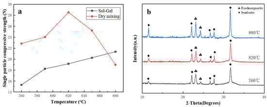 Single particle compressive strength of stacked abrasives prepared by the sol-gel and dry mixing methods (a) and XRD patterns of stacked abrasives prepared by dry-mixing method (b).