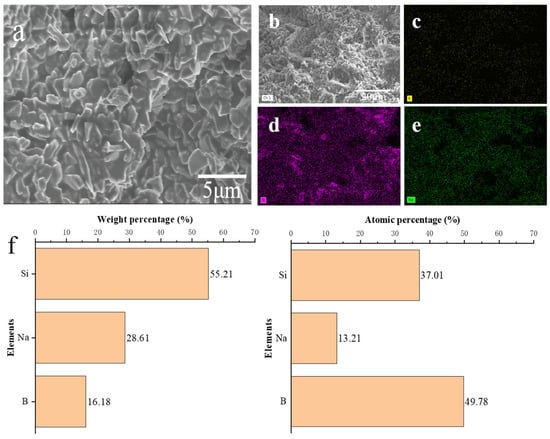 SEM (a,b) and corresponding EDS of diamond stacked abrasives: (c) B, (d) Si, (e) Na, and (f) elemental composition.