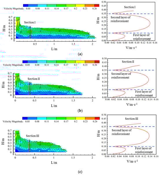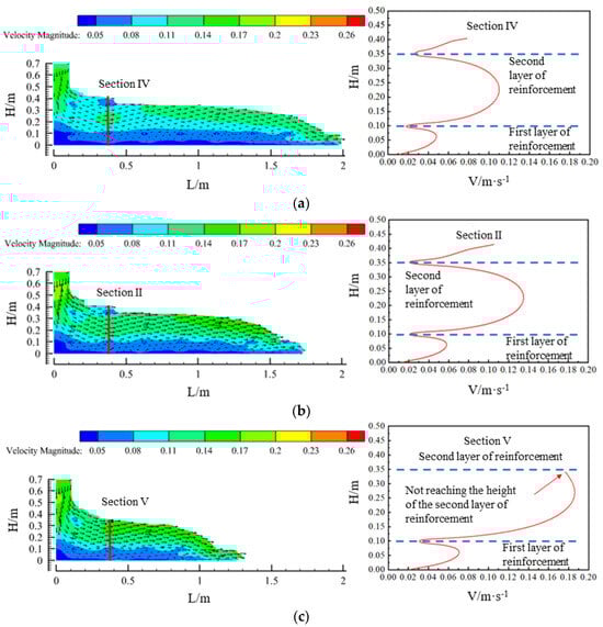 - During the sidewall pouring process, the freshly mixed concrete showed an overall velocity stratification phenomenon, and the upper concrete flow velocity was larger. The slumping degree in the flow field had little effect on the flow velocity of the concrete, while, with an increase in the pumping flow rate, the overall flow velocity of the concrete in the flow field increased significantly.