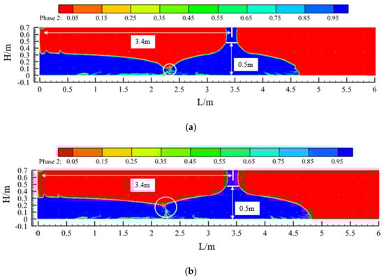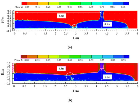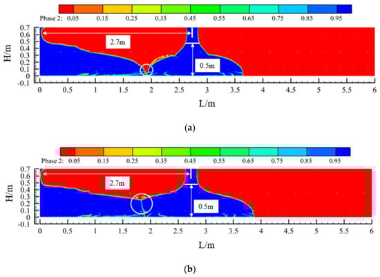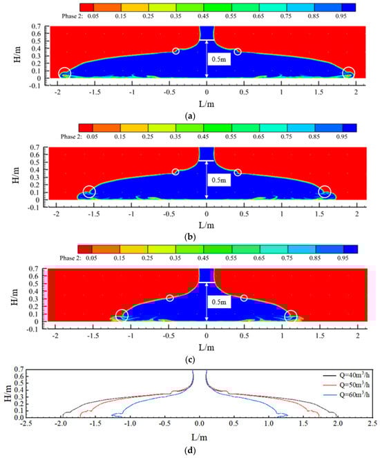 - During the pouring process of the sidewall, the freshly mixed concrete flowed from the pouring window to the two sides at a specific initial speed under the action of its own gravity, and then the concrete was blocked by the reinforcement in the formwork. When the concrete flowed into contact with the first two layers of reinforcing bars, the liquid level exhibited a leap phenomenon. With a decrease in the concrete slump and an increase in the pumping flow rate, the slope of the concrete level curve between the two leaping points showed an increasing trend, and the leaping phenomenon continued to weaken as the pouring continued.