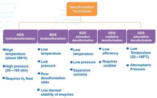 Sulphur-containing compounds in fuel oils mainly include aliphatic organic sulfides such as mercaptans, sulfur ethers, disulfides, and in particular aromatic heterocyclic sulfur-containing compounds such as TH, BT, and DBT and their respective alkyl-substituted derivatives, which are difficult to remove. They must be further removed in accordance with industrial requirements and applicable regulations [8]. Therefore, the development of a sustainable and efficient desulphurization technology is still a hot area of scientific research. There are several ways to remove sulfur from liquid fuels, such as hydrodesulfurization (HDS) [9], biodesulfurization (BDS), extraction desulfurization (EDS), oxidative desulfurization (ODS) [10,11,12], and adsorption desulfurization (ADS) [13,14] (see Figure 2).