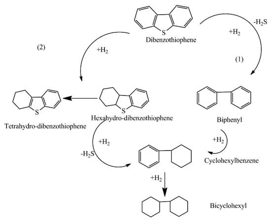 HDS is the earliest and most mature desulfurization process [15]. As one of the important processing techniques in the current petroleum refining process, HDS has been able to meet previous limits on sulfur content in the production of clean fuels. HDS is a process that removes the sulfur impurities directly by converting the sulfur impurities to gaseous H2S through a hydrogenation reaction under the action of catalysts. It is worth noting that hydrogen from the catalytic reformer greatly facilitates hydrodesulfurization, enabling an efficient conversion of organic sulfur compounds to H2S and sulfur-free compounds to reduce sulfur content [16,17]. Taking the reaction of HDS with DBT as an example (see Figure 3), the first pathway (1) involves direct desulfurization, in which sulfur atoms are eliminated directly from the DBT molecule. The second pathway (2) involves hydrogenation, in which the DBT molecule is first partially hydrogenated and then the sulfur is eliminated by hydrogenolysis of the C-S bonds [18].