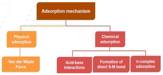 Chemical adsorption is achieved through the complexation reaction between the adsorbent and the sulfur-containing compounds, resulting in chemical bonding (π bond/σ bond), thus realizing the adsorption of sulfur-containing components [18]. The specific desulfurization mechanisms of chemical adsorption are mainly acid–base interactions, formation of direct sulfur(S)–metal(M) bonds (σ), and π-complex adsorption (Figure 4). In the acid–base interaction mechanism, most thiophene sulfides in the fuel are Lewis bases, which are easily adsorbed by Lewis acid-type active sites. Therefore, materials that can form Lewis acid sites are generally selected as adsorbents to adsorb thiophene sulfides containing lone pair electrons in fuel. For instance, Xiong et al. [44] prepared boron nitride nanosheets with different degrees of boron defects using barbituric acid as a co-reactive source. By changing the electronic structure of BN, the conduction band of BN decreased from −1.35 eV to −0.54 eV. Meanwhile, the hardness of the chemical acid was reduced, which made it easier for a soft-acid–soft-base interaction with DBT to occur. In order to enhance competitive adsorption with aromatic hydrocarbons, some reports have suggested that the adsorption selectivity can be improved through the formation of direct sulfur–metal bonds. This action is the direct formation of sulfur–metal σ-bonds by giving the lone pair of electrons from the sulfur atom in the organic sulfide to the metal atom of the adsorbent. Unsaturated metal sites have a strong affinity for sulfides and the direct formation of S-M bonds could enhance the desulfurization performance of the adsorbent. The π-complexation is realized by the formation of pi (π) complexes by electron transfer between the adsorbent and the reactants. Khan et al. [45] explored the effect of initial BT concentration on the adsorption capacity of MIL-47(V) and MIL-53(Cr). It was shown that acid–base interactions and n-complexation were the main forces involved in the process. Compared with physical adsorption desulfurization, this method is more selective for aromatic sulfur compounds. However, chemical adsorption desulfurization requires high reaction temperatures and the regeneration of the adsorbent is difficult, which needs to be calcined or washed with a specific solvent [1,46,47].