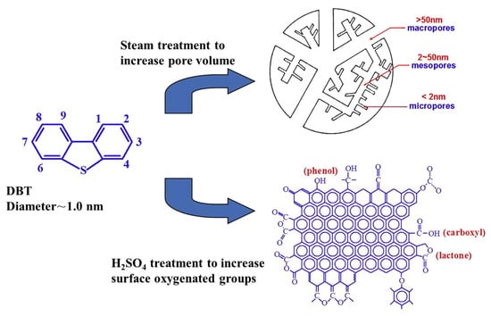 - Deng, L.L.; Lu, B.Q.; Li, J.L.; Lv, G.Q.; Du, S.J.; Shi, J.Y.; Yang, Y.X. Effect of pore structure and oxygen-containing groups on adsorption of dibenzothiophene over activated carbon. Fuel 2017, 200, 54–61. [Google Scholar] [CrossRef]