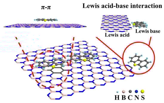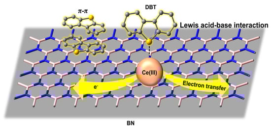 In recent years, many two-dimensional (2D) materials, such as graphene, graphyne, MXene (X refers to group IV, V, or VI elements), and boron nitride, have attracted attention due to their unique structures and properties. Among them, boron nitride (BN) stands out due to its honeycomb atomic structure, oxidative stability, and strong regeneration capability. For instance, Yan et al. [111] found that porous BN microfibers have excellent adsorption desulfurization performance. The adsorption capacity of DBT could reach 86 mg S/g. Interestingly, the adsorbed porous BN could be regenerated by simple heat treatment. Inspired by their study, Luo et al. [112] developed a Lewis acidic BN for DBT (500 ppm S) desulfurization by adding Ce (III). The new Lewis acidic sites formed by two neighboring Ce (III) in this adsorbent enhanced the overall acidity. Meanwhile, utilizing the Lewis acid–base interaction between dibenzothiophene and the adsorbent acid sites, the adsorbent showed an excellent adsorption capacity with a sulfur capacity of up to 48.4 mg S/g. Furthermore, the strong Lewis acid sites in the adsorbent could also alleviate the competitive adsorption of aromatics and improve the selectivity of dibenzothiophene (see Figure 14). In recent years, Li et al. [113] developed a new CeVO4/BNNS adsorbent supported by boron nitride nanosheets. Under the conditions of reaction temperature of 130 °C, a catalyst dosage of 0.33 g, a simulated oil dosage of 110 mL, and an air pump flow rate of 150 mL/min, the removal rates of 4,6-DMDBT, DBT, and BT reached 100%, 99.62%, and 71.29%, respectively. At the same time, the adsorbent has good recycling and regeneration performances. The desulfurization rate of CeVO4/BNNS can still reach above 91% after being recycled six times.