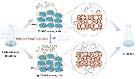 - Xiao, Y.H.; Fu, J.H.; Zhu, H.Y.; Zhao, Q.D.; Zhou, L. Facile and controllable preparation of nanocrystalline ZSM-5 and Ag/ZSM-5 zeolite with enhanced performance of adsorptive desulfurization from fuel. Sep. Purif. Technol. 2022, 288, 120698. [Google Scholar] [CrossRef]