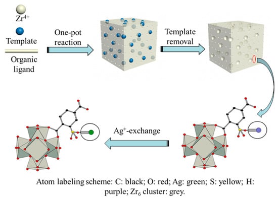 Schematic diagram of HP-UiO-66-SO3H preparation and Ag+-exchange. Reprinted with permission from Elsevier [90].