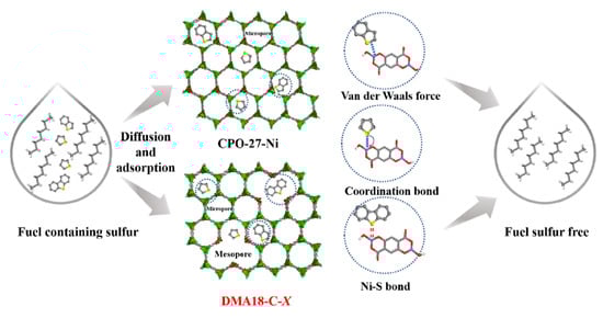 In recent years, defective MOFs have been gradually applied in the adsorption desulfurization field because of their adjustability. In order to increase the number of active sites for adsorption desulfurization, Lu et al. [91] synthesized the defective CPO-27-Ni (DMA18-C-X) adsorption material using DMA18 as a template. The adsorption experiments showed that, when the molar ratio of DMA18 to Ni2+ was 0.5, the dynamic adsorption capacity of DMA18-C-0.5 for DBT, BT, and TP (100 ppmw) was 3.79, 6.45, and 9.29 times that of traditional CPO-27-Ni. The reasons for the enhanced adsorption desulfurization performance are shown in Figure 10. The mesoporous formation of DMA18-C-X material greatly enhances the mass transfer of sulfide in the adsorbent, weakens the effect of steric hindrance, effectively promotes the exposure of more unsaturated Ni2+ active sites, and enhances the full contact between Ni2+ active sites and sulfide. Finally, the sample showed an excellent regeneration performance. After three cycles of regeneration, the adsorption capacity of DMA18-C-0.5 was 86.30%, 85.59%, and 83.9% of the fresh samples’, respectively.