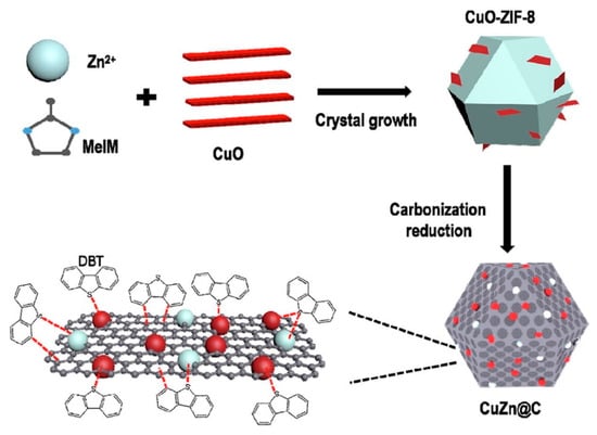In addition, MOFs can form composites with excellent adsorption properties in conjunction with other materials such as metals and nonmetallic compounds. For example, Huo et al. [92] first pre-grew ZIF-8 on CuO nanosheets, and then successfully synthesized Cu and Zn bimetallic doped porous carbon (CuZn@C) using the carbonization method. The preparation method is shown in Figure 11. The specific surface area of the adsorbent was increased via the evaporation of Zn in the process of high temperature carbonization. The Cu (I) obtained by Cu (II) reduction is uniformly dispersed and embedded in the carbon matrix derived from ZIF-8, effectively forming π-complexation with thiophene sulfur compounds. Due to the uniform distribution of bimetallic active sites and its excellent structure, the obtained CuZn@C has superior ADS properties. Chen et al. [93] successfully prepared a novel composite material, Fe3O4-ATP/MOF-199 (FAM), by compositing MOF-199, attapulgite (ATP), and Fe3O4 using the solvent-thermal method and used it for the removal of TP from model oils. MOF-199, as a porous material with a large specific surface area and a high porosity, can be accessed by TP to remove sulfur compounds using intermolecular forces. The addition of ATP changes the crystal structure of magnetic MOF-199, which brings sulfide closer to the active center of the adsorbent and improves its adsorption capacity and selectivity. However, due to the strong interaction between the metal center of the adsorbent and the sulfur atoms in thiophene, the active site of the adsorbent was reduced, and the repeated adsorption effect was poor.