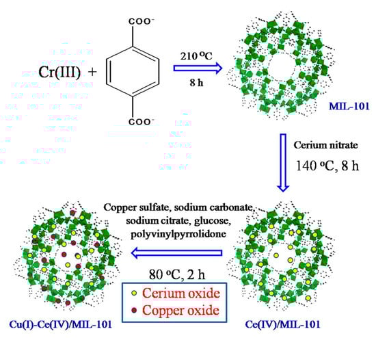 Illustration of the synthesis of Cu-Ce/MIL−101. Reprinted with permission from Elsevier [95].