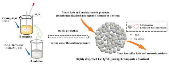 - Yin, L.X.; Xu, J.C.; Zhang, B.; Wang, L.G.; Tao, W.Y.; Teng, X.; Ning, W.S.; Zhang, Z.K. A facile fabrication of highly dispersed CeO2/SiO2 aerogel composites with high adsorption desulfurization performance. Chem. Eng. J. 2022, 428, 132581. [Google Scholar] [CrossRef]