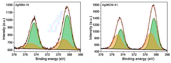 Mesoporous silica, as one of the most widely studied ordered mesoporous materials, has the advantages of an adjustable pore structure and a large specific surface area (700–1300 m2/g) [114,115,116]. Therefore, mesoporous silica has unique properties in adsorption desulfurization. Figure 15 illustrates several common types of mesoporous silica, including SBA-15, MCM-41, and KIT-6 [2]. However, the ion exchange capacity of mesoporous silica is limited due to a weak surface interaction. Accordingly, it is necessary to modify them. Recently, incorporating active metals into carriers has provided new ideas for the modification of mesoporous silica. Liu et al. [117] successfully obtained Ag/SBA-15 and Ag/MCM-41 adsorbents by using SBA-15 and MCM-41 mesoporous materials loaded with silver. The XPS results showed that the silver in Ag/SBA-15 and Ag/MCM-41 adsorbents were dominated by metallic silver, and some of the silver strongly interacted with the carriers to form Ag-O-Si bonds, which act as the main active center in the thiophene compounds. The binding energies of Ag 3d5/2 and 3d3/2 orbitals in Ag/SBA-15 and Ag/MCM-41, corresponding to Ag nanoparticles and metallic “bulk” Ag, were centered at 368.4 and 374.4 eV due to small charge effect. The other pairs of orbitals at higher binding energies of 369.0 and 375.0 eV were attributed to more oxidized surface Ag atoms being bonded to the surfaces of SBA-15 and MCM-41 (Ag-O-Si) due to a large charge effect (see Figure 16). The adsorption experiments demonstrated that the desulfurization efficiency of Ag/SBA-15 and Ag/MCM-41 adsorbents increased with the increase in Ag-O-Si content. Interestingly, due to the fact that TP can be efficiently adsorbed to the Brønsted acidic sites of SBA-15 and MCM-41 via S-H bonds, they exhibit a high level of selectivity in thiophene-cyclohexane and tetrahydrothiophene-cyclohexane solutions. A summary of various mesoporous silica adsorption materials performance for ADS was shown in Table 4.