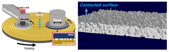 Semiconductor processing technology has led to decreased transistor sizes and an increased number of integrated transistors, resulting in highly integrated semiconductor devices with high performance [1,2]. To integrate more devices, a multilevel interconnection structure is essential, and a surface planarization process is required for the stable deposition of the layers [3]. Chemical mechanical planarization (CMP) is a semiconductor process that enhances the quality of integrated circuits. Global planarization can solve the problem in the lithography process, wherein the depth of focus is less than the step height, and aid the development and mass production of next-generation devices [4,5]. Figure 1 depicts a schematic representation of a typical CMP process and the 3D topography of the pad surface where contact occurs with the wafer during CMP.