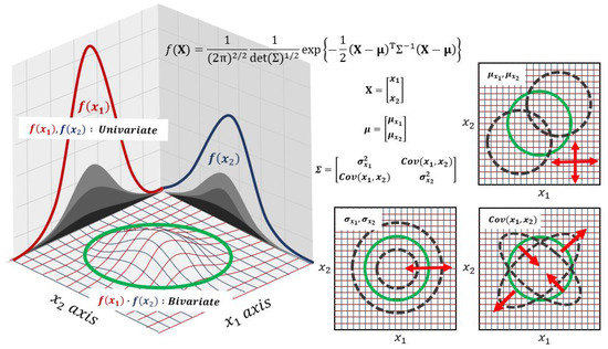 The key characteristic of the multivariate normal distribution is its representation of data in a multidimensional space. In this study, we used bivariate normal distribution theory, which uses two variables among multivariate normal distributions. In general, elements composing the bivariate normal distribution function include variables (), standard deviations (), covariances (), and mean values (). Figure 2 shows a schematic diagram of this theory, illustrating the correlation between each component and the bivariate normal distribution. The two variables each follow a univariate Gaussian normal distribution, and through the derivation process, these distributions are extended to a bivariate normal distribution. The mean values of each variable can shift the overall distribution, and the standard deviations can adjust the variance of the overall distribution. Finally, the covariance between the two variables reflects the correlation between the two univariate distributions, and it alters the shape of the bivariate distribution accordingly. The detailed derivation process and explanation are described in Section 3.2.
