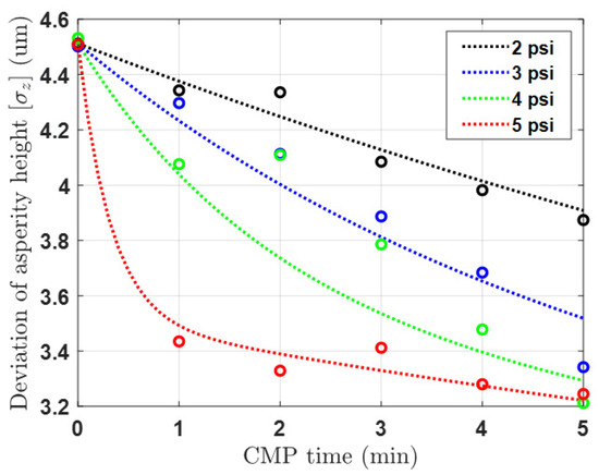 where , and denote the initial deviation in asperity height and the coefficient factors related to the fitting equation of asperity deviation, and the values are 4.512, , 21.5, 1.411, and 2.405, respectively. Further, , and denote the coefficient factors related to the fitting equation of mean radius, and the values are 0.28, 5.45, 0.18, and 0.621, respectively. In the case of the pad protrusion radius, it was observed that the variation in deviation with respect to the conditions was not significant, and the overall distribution was largely dependent on changes in the mean value. Therefore, the deviation in the radius was kept fixed at its initial value in the experimental formula. The parameter coefficients of the above experimental formula can vary significantly depending on the specific pad used in the experiment. Thus, it is essential to conduct an analysis of the pad used before conducting the experiment. By substituting the experimental values into Equations (13) and (14), the asperity distribution over CMP time obtained from the experiments can be determined. Additionally, these data are utilized to derive an empirical model equation through comparison and analysis with the mathematical model equation for the time-dependent asperity distribution outlined in Section 3.2.