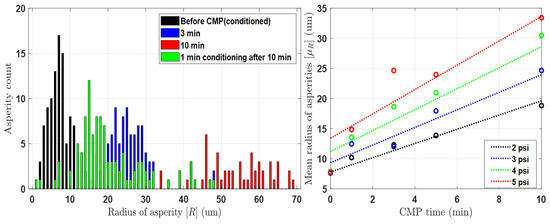 (Left): Distribution of pad asperity radius before and after 4 psi CMP process. (Right): Mean radius after CMP according to pressure and time conditions.