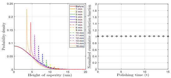 where in the asperity density function denotes the effective asperity height between the wafer and the CMP pad. The effective asperity height varies over time to maintain load balance. Therefore, it is preferable to express as a function of time, and it can be mathematically derived since it cannot be obtained through measurements. This derivation is based on the force equilibrium equation, which asserts that the sum of contact loads on the wafer and the applied loads on the polishing head are equal. Figure 8 shows a graph for each distribution function over time. Unlike the case where only height wear or only radius wear is considered, the novel PDF proposed in this study can reflect the shape changes of asperities and their distribution in more detail. Therefore, we proposed a physical model that can predict material removal based on this novel function.