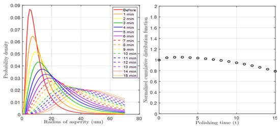 (Left): Simulation of time-dependent asperity radius distribution. (Right): Sum of the probability density varied due to radius wear at each CMP time.
