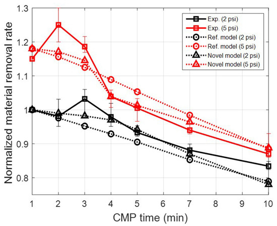 Figure 9 shows the normalized MRR result over pressure and CMP time. The initial MRR under a pressure condition of 2 psi was used as the reference for normalization. In each pressure condition, the MRR decreases with the CMP time. This is because conditioning between CMP processes does not take place, leading to the sustained wear of the pad asperity without recovery. However, in actual CMP (solid lines in Figure 9), the MRR does not show a pronounced decrease initially. Instead, it either increases or remains stable. Subsequently, as the CMP time continues and passes a certain duration, the MRR decreases rapidly. This means that the conditioning process is not necessary at every moment. Since the conditioning process ultimately consumes the life of the pad, it needs to be applied appropriately according to the condition of the asperities and the MRR results.