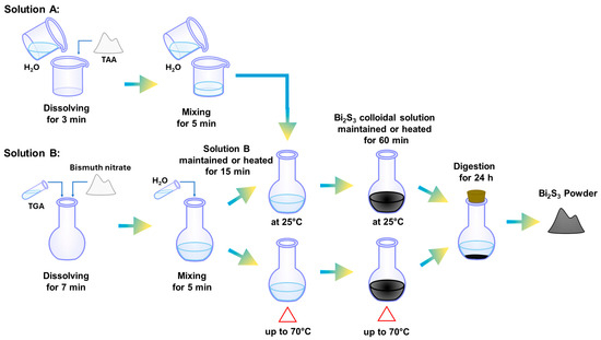Following the synthesis process, the heating source was turned off, and the resulting solution was left to undergo a 24 h digestion period. This digestion process facilitates the separation of the solid phase, forming a sedimented floc, from the liquid phase. The liquid phase, containing dispersed Bi2S3 nanoparticles and byproducts, was carefully poured off. To ensure a neutral pH, the floc was subjected to multiple washes. Finally, the floc was effectively dried by heating it at 70 °C. Figure 1 details the entire Bi2S3 synthesis process described in this section.