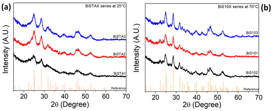 XRD patterns of the Bi2S3 samples. (a) Samples corresponding to the BiSTAX series (synthesized at 25 °C) and (b) samples corresponding to the BiS10X series (synthesized at 70 °C). Notice that the vertical lines belonging to the bismuthinite mineral reference card ICCD No. 00-006-0333 were added.