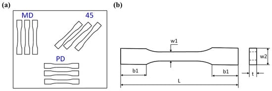 The tensile tests were carried out on the basis of standard UNE EN ISO 527-1:2020-01 using an INSTRON testing machine. The constant speed of the moveable traverse was assumed to be stable and equal to 2 mm/min. As a result of tests, the diagrams of force vs. elongation were obtained. The samples were cut out from the plate according to the scheme shown in Figure 1a, where the symbols mean the following: MD—main direction; PD—perpendicular direction; and 45—angle orientated to the plate edges. The dimensions of the samples were based on the aforementioned standard: L = 170 mm, b1 = 40 mm, w1 = 10 mm, w2 = 20 mm, and mean thickness t = 3 mm (Figure 1b). The Young’s modulus of the composite was determined by using an extensometer with a gauge length of 50 mm.