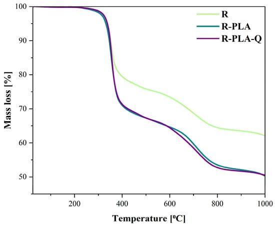 The thermal decomposition of all tested samples occurred in two step degradation. The first step occurred approximately between 230 and 400 °C followed by the second step around 400 to 780 °C. Analyzing the T5% temperature values in Table 3, which are commonly considered as the initial temperature of the thermal decomposition of the samples, it can be observed that the addition of polylactide only minimally reduced the thermal resistance of the epoxy resin, while the addition of both polylactide and quercetin allowed for the preservation of this property. Much greater differences are more visible in the further stage of material degradation, when the temperature at which the mass change is 30% is equal to 676 °C for the reference resin sample and 414 °C for the composite with polylactide addition. It should be emphasized, however, that the content of quercetin in the R-PLA composite improves the thermal resistance of the material at various stages of degradation. Moreover, the weight fraction showing the percentage of unburned residue of the sample after the measurement is probably due to the presence of the glass fabric as well as the presence of mineral additives in the resin mixture (e.g., flame retardants, etc.).