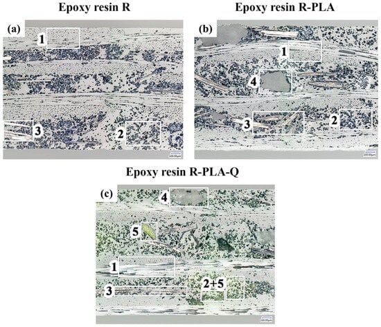 Cross-section images of (a) pure epoxy resin composite (R), (b) epoxy resin composite containing polylactide (R-PLA), and (c) epoxy resin composite with polylactide and quercetin (R-PLA-Q). 1—glass fabric layers; 2—epoxy matrix with APP particles; 3—graphite flakes; 4—PLA particles; 5—quercetin particles. Microstructures obtained at magnification of 200×.